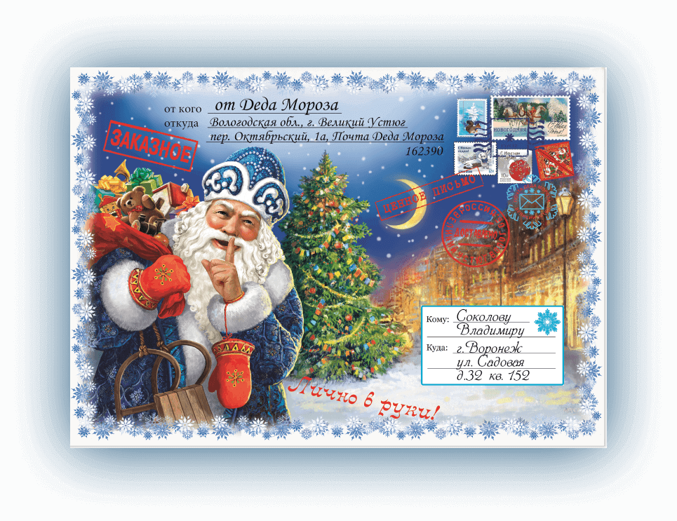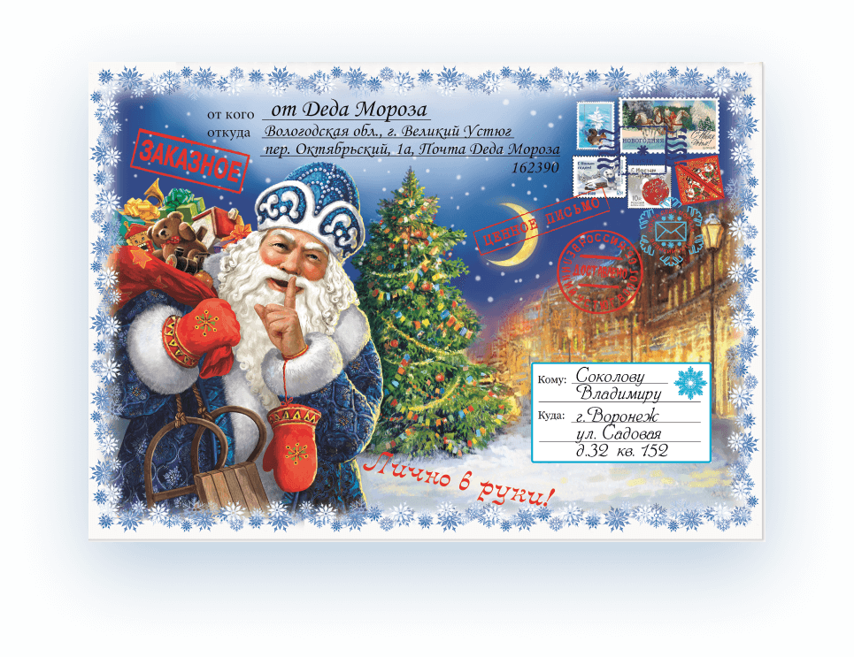 Самая важная составляющая конверта, безусловно, само письмо от Дедушки Мороза! Это письмо написано необычным Дедушкиным почерком на специальной бумаге большого размера (А4). В нем увлекательный рассказ из жизни Дедушки Мороза и теплое поздравление с Новым Годом. Дизайн и тексты писем разрабатывались профессиональными дизайнером и писателем! Тексты разные для женщин и мужчин.